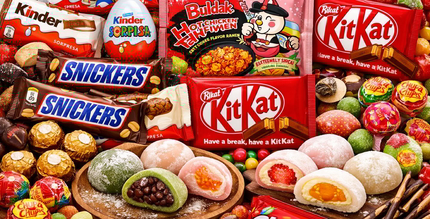 Colorful assortment of Asian candies displayed in traditional packaging on a wooden table