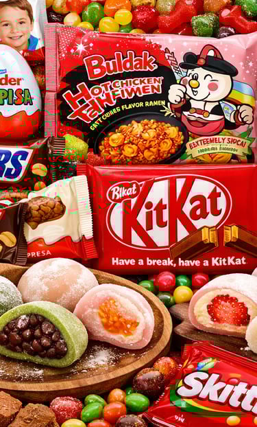 A joyful child holding a mix of candies from different cultures with a big smile